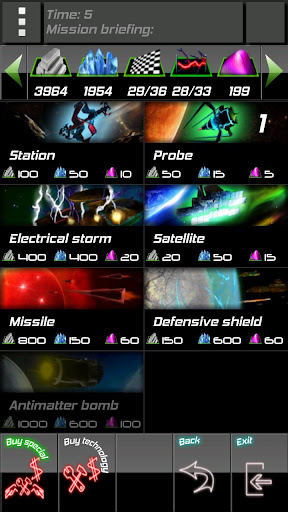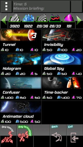 7 technologies to raise your domination. For instance: turn back in time, planetary tunel, invisibility, hologram, antimattern layer.