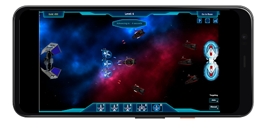 Ships can be set to automatic or manual aiming. By gathering resources, players can acquire new ships and upgrade their weapons and armor. The available ship types include fighters, escorts, and cruisers. To navigate challenging situations with multiple enemies, players can activate shields for escape or to continue advancing.