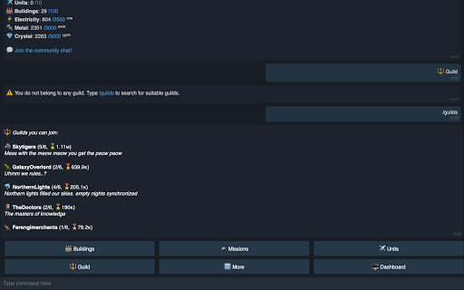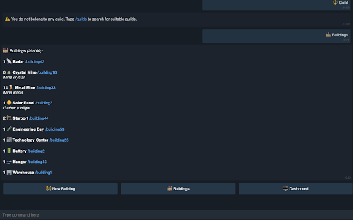 You are the ๐จโโ๏ธ Commander of your own planet where you can have ๐ญ Buildings and โ๏ธ Units (spaceships). From each ๐ญ Building you can run jobs: gather resources, research skills, build Units, teleport, and much more.