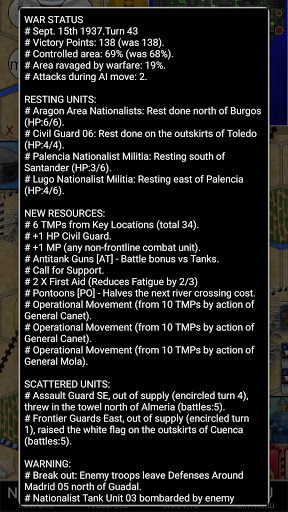 You are in command of the armed forces of the Nationalistic Faction, which after its semi-failed coup finds itself in control of two separate areas inside Spain, while the majority of soldiers and the biggest cities of Madrid and Barcelona stay loyal to the left-leaning Republican side. While most countries choose a non-interventionist policy in the Spanish Civil War (Guerra Civil Española), the Communist Soviet Union gives its support for the Republic (Popular Front), which also operates famous International Brigades, while Germany and Italy provide support for the conservative Nationalist side.