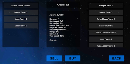 Large variety of turrets that can be put on space ships (lasers, blasters, miniguns, cannons, missiles, torpedoes…). Turrets can have different stats such as: damage, range, rotation speeds… It is up to you to choose the perfect turrets for your space ship and transform it either into close-range brawler, long-range sniper or support ship.