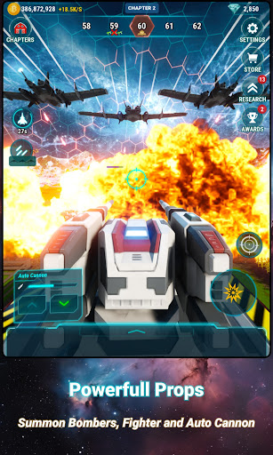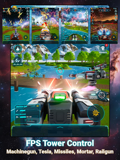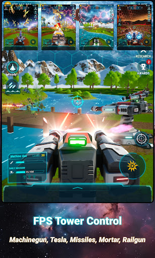 In this tower defense game, purchase, upgrade, and merge 5 types of defense towers (Machine gun, Tesla, Missile, Mortar, Rail gun) to challenge more waves of attacks.
