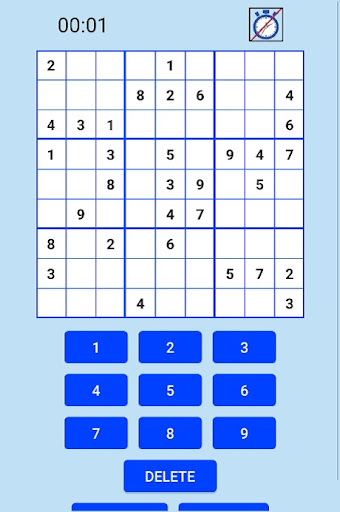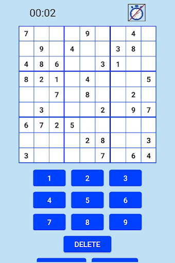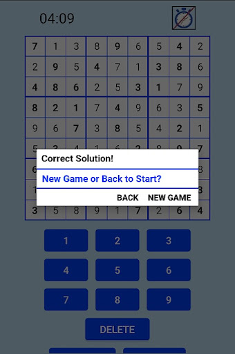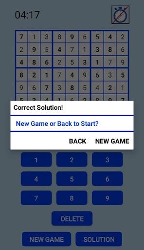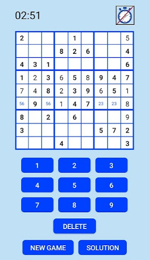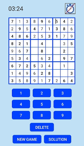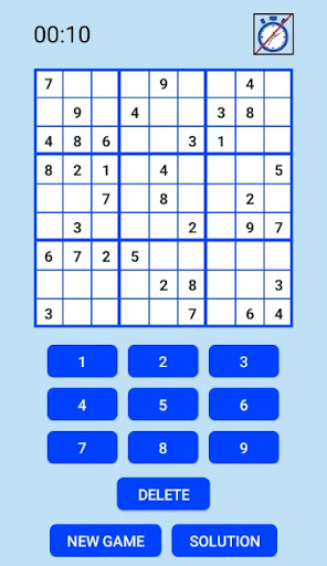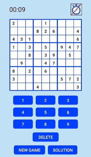 The goal is to write the numbers from 1 to 9 once in each row, each column, and each 3×3 subgrid of the 9×9 Sudoku grid. If the user presses the buttons “New Game” (a new Sudoku grid is loaded) or “Solution” (the solution of the current Sudoku is displayed), the current game is considered lost.