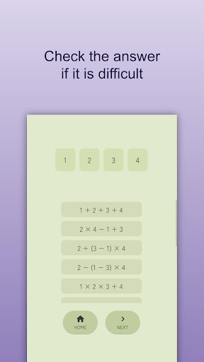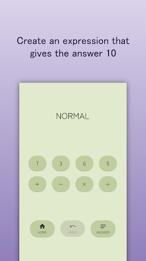 “EASY”, “NORMAL”, “HARD” creates an expression that gives 10 with given 4 numbers. The numbers given depends on the level.