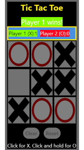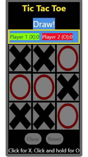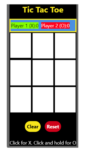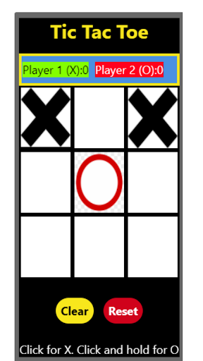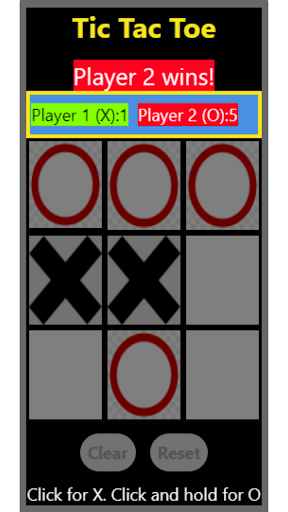 Tic Tac Toe a game in which two players alternately put Xs and Os in compartments of a figure formed by two vertical lines crossing two horizontal lines and each tries to get a row of three Xs or three Os before the opponent does. Press for X, Long Press for O. Clear button clears the current play. Reset button clears the current play and scores.
