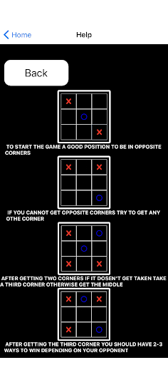 A strategy game with 2 players, one player as X and one player as O, they are against each other at a board of 9 boxes. As players exchange turns they can put their letter in the boxes. Once a box is taken it cannot be used again. The goal of the game is to arrange your letter in a row, column, or diagonal of three before your opponent and while blocking them. The game also includes a special feature, the help page, this page includes tips and tricks to help get better at the strategy of the game. It will always be a fun game to past time with friends.