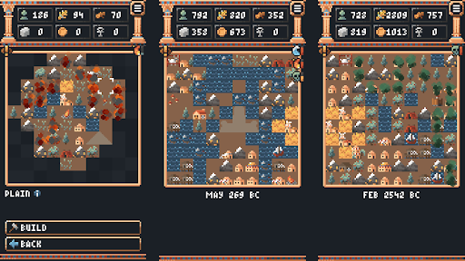 Each scenario map is divided into 100 tiles, where each tile can support a different building. Each building produces varying amounts of resources. Discover all the tiles, choose your building strategy, and achieve your goal as quickly as possible.