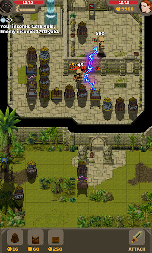 You get gold every 30 seconds of your income. To get more income, you need to buy monsters that will attack the opponent. You also get money from monsters you kill but only once. It is important to combine offense and defense so that the opponent does not get significantly more income than you. You win by sending monsters that take all of the enemy’s lives.