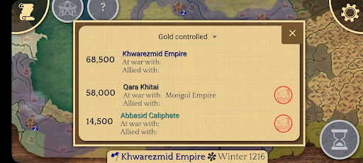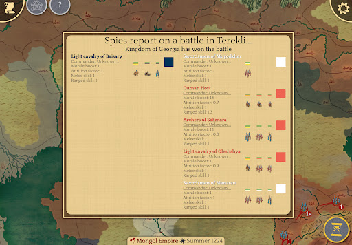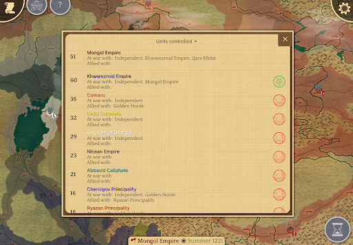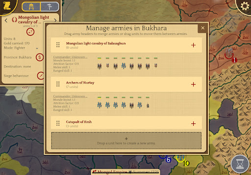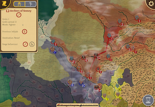 Command the Mongols or the Khwarezmid empire in their struggle for control of Central Asia. Command armies across the campaign map spanning from Western Mongolia to Eastern Anatolia in this medieval grand strategy game. The game uses an innovative blend of turn-based and real-time mechanics to eliminate first-mover advantage in tactical battles. You command the army but not individual soldiers, so units will make local tactical decisions by themselves letting you focus on strategy. Reduced micromanagement requirements make the gameplay better suited to tablets and playing on the go without sacrificing depth.