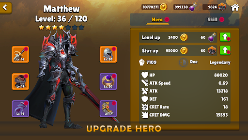 Build a strong Hero that can withstand any attack. Choose your Hero you want to build and upgrade him to the strongest. Level up your hero, unlock skill, unlock hero item and get more power. Determine the best items and spells for your Hero to match your individual play-style. Place mighty knights and to defend your castle.