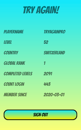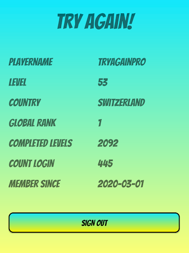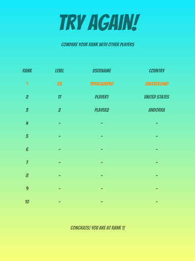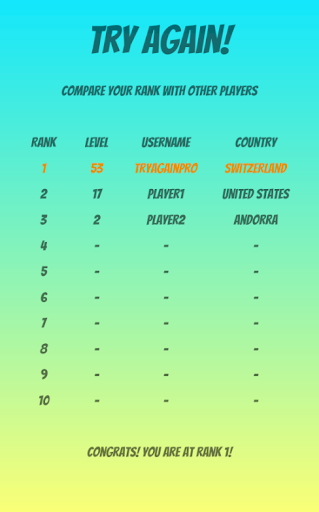 Your player level and experience points will be compared to other players using the app. Visible is your level, username and country. This is your opportunity to show other players, that you are the best! Get at the top of the ranks!