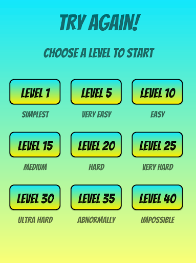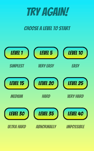 There are nine difficulty levels, which are defined as Simplest, Very Easy, Easy, Medium, Hard, Very Hard, Ultra Hard, Abnormally and Impossible. The difficulty switches automatically to a higher one, if a certain game level is reached. This will be every five levels.