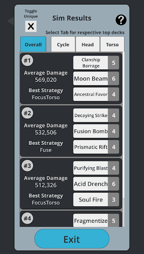 – OPEN SIM allows you to manually choose any Player Raid Level, Deck combination, Card levels, Titan health, and Strategy to run a massive amount of simulations for an accurate rundown of the expected damage. You can even choose to run the sim across ALL pre-coded strategies to output the best one.