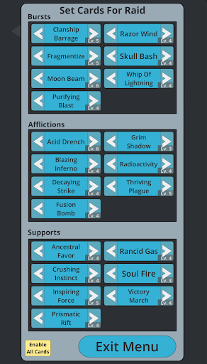 – RAID MANAGER is where the real magic happens and where you’ll likely spend the most amount of time. Save your Player Raid Level, available Cards, and Levels and run simulations across every possible Deck combination to output lists of the maximum damage Decks for the specified remaining Titan health. Maximize your clan contribution by picking your attacks from these results.
