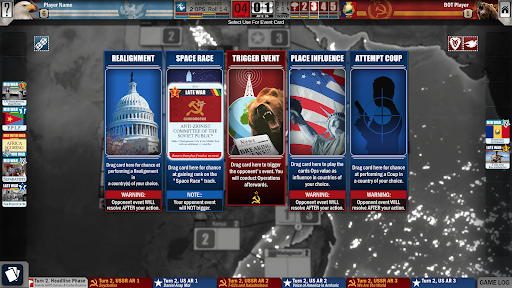 Lead the global policy in this 2-player, card driven strategy game and take the role as either the United States or the Soviet Union. Engage in varying actions that are vital to regional stability such as spreading political influence, conducting military coups, or attempting favorable political realignments. It is your goal to gain allies and be the leading worldwide superpower. But be careful not to overreach, as one wrong decision can lead to DEFCON One and a game ending nuclear war!