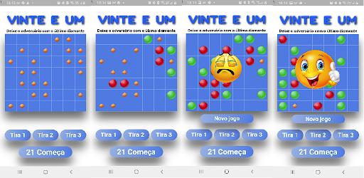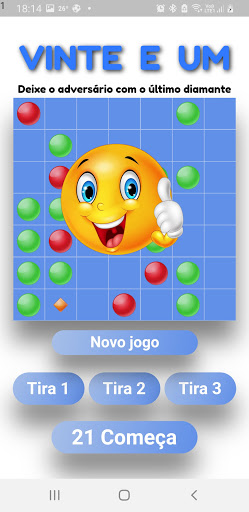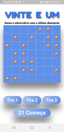 O jogo Vinte Um se dá entre o jogador e o aplicativo com o objetivo de deixar o adversário com o último diamante podendo retirar um, dois ou três diamantes em cada lance.