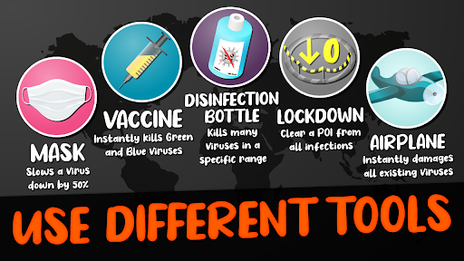π§° Use the best tools to wipe out the bio hazard virus! The biological warfare tools you have in your disposals are: mask, vaccine, disinfection bottle, lockdown (quarantine), and airplane.