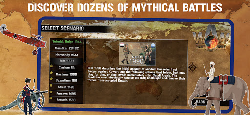 The application contains the scenario Normandy 1944. Several other scenarios are purchasable in content inApp, including: Hamilkar 264 (First Punic War), Hastings 1066 (Conquest of England), Saratoga 1777 (American War of Independence), Waterloo 1815 (Napoleonic wars), Bull Run 1861 and Missouri 1861 (Civil War), Tannenberg 1914 (World War I), Malaya 1941 (WW2 Malaysian campaign), Bulge 1944 (WW2 Battle of the Bulge), Berlin 1945 (End of World War II) ) and Six Days 1967 (Six Day War).