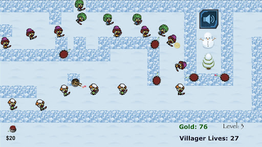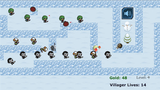 A fun winter-themed tower defense game. Some creepy clowns and some other odd looking characters are trying to storm the village. Strategically place towers to prevent them from getting there. Select a tower by touching it and then place it on the game screen by touching the rough area of the screen where you want the tower. When you are finished placing towers for each level click the Start Wave button to start the next wave.