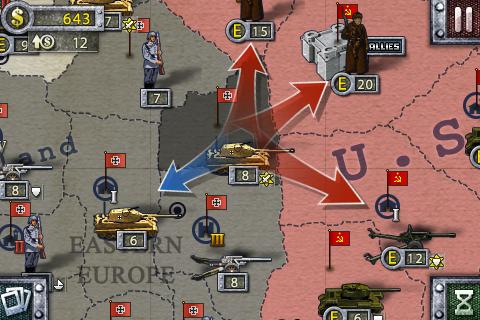 During the game you need to operate and distribute the three basic troops reasonably which include soldiers, tanks and artillery.(Soldier troop with high yields but general attack, tank troop with high attack and continue action when complete destroying the enemies, artillery troop attacks soldier troop and tank troop while they cannot strike back),judge on the current situation correctly at any time for the AI is outstanding. The attributes of arms are different from each country. For example, the tank of Germany is most powerful but with high price, the cannon of the Soviet Union is excellent, the navy of Britain is best.