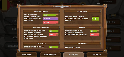 In the game there are 56 countries for choice, at the beginning of the game you choose 1 or more countries, and playing for the country you have to conquer half of the map.
