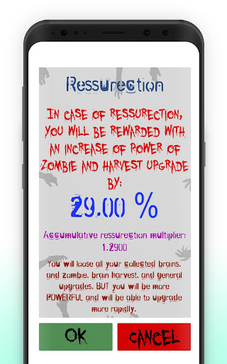 Whenever you reach a plateau and feels that upgrading is getting long times, you can always choose Resurrection from the Option Menu where you will loose everything from the collected brains to all other upgrades but your progress will turn into an accumulative multiplier that will increase your power for your next life making you getting your “hard” upgrades more easily!