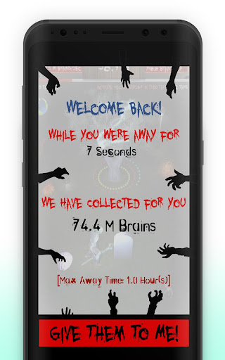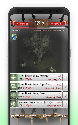 Hell Vision is a special time where the zombie tapping powers are multiplied and you can get this every set of taps. You can increase the multiplier value, decrease the amount of tapping needed to get Hell Vision, or increase Hell Vision time. All this from the general upgrades menu alongside with the ability to purchase an increment of the maximum away time so you will get more return from auto-brain-harvesting whenever the game is put to sleep.