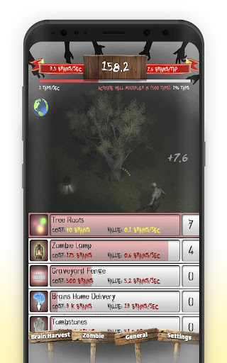 Get brains by tapping and making your zombie gather them to either buy zombie upgrades to strengthen his wrath making him collect more brains per tapping or buying Brain Harvesting techniques to automatically collect more for you!