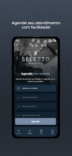 Através do App Barbearia Seletto os clientes podem realizar seus agendamentos de uma forma muito mais prática. Na tela inicial, é possível selecionar os serviços e horário desejado para seu próximo atendimento. Já na tela de histórico, você poderá avaliar como foi o seu atendimento, remarcar ou cancelar seus agendamentos. É possível também na tela do perfil o cliente editar suas informações, como e-mail, foto de perfil e telefone.