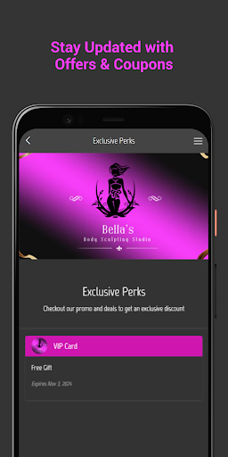 The official app of Bella Body Sculpting Studio will keep you aware of all exclusive services available for you. We provide a wide variety of beauty services. Stay up today with Bella Body Sculpting Studio’s special offers, sales events and loyalty coupons. Our mobile app updates are done on a weekly basis. This app contains an amazing amount of features as we decided to implement modern tabs that allow you to send pictures, reserve an appointment and even hear music to keep you entertained.
