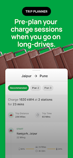 * Confidently go on long drives to anywhere across India with built-for-you Trip Planner. Input only your starting point, destination, and battery level, and our algorithm will do the rest to provide an ideal set of charging stops on your trip.