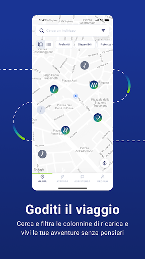 • Avere informazioni aggiornate in tempo reale sulla disponibilità di ciascuna colonnina elettrica lungo il tuo