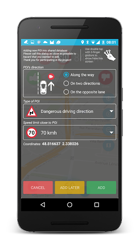 This application uses database of POI and hazards previously detected by other users.