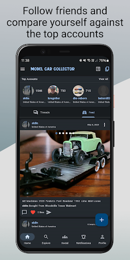 • View rankings for top accounts, most liked cars, largest collections by manufacturer, and more.