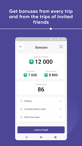 • Bonus program (earn bonuses from your trips and from trips of friends you invite; share bonuses with friends or use them to pay for your trips).